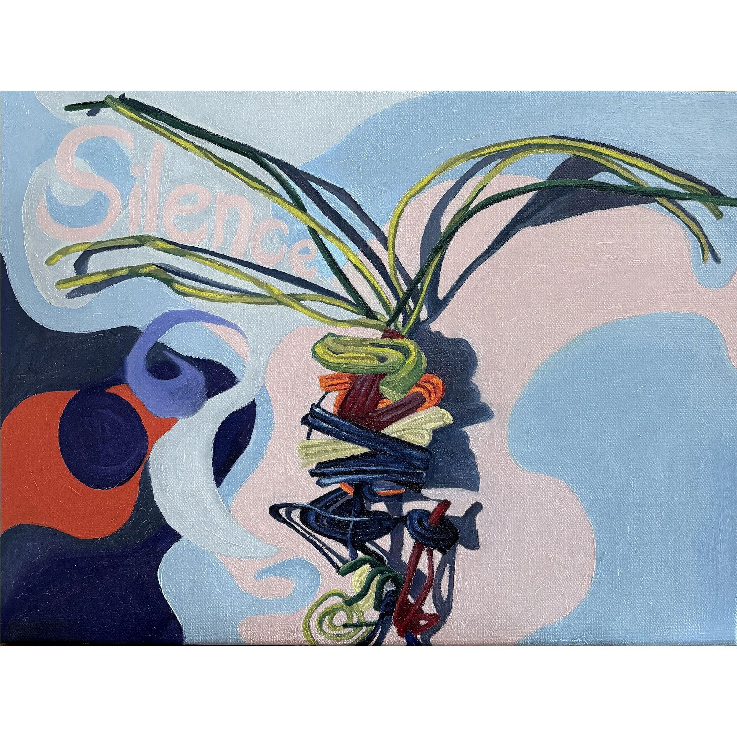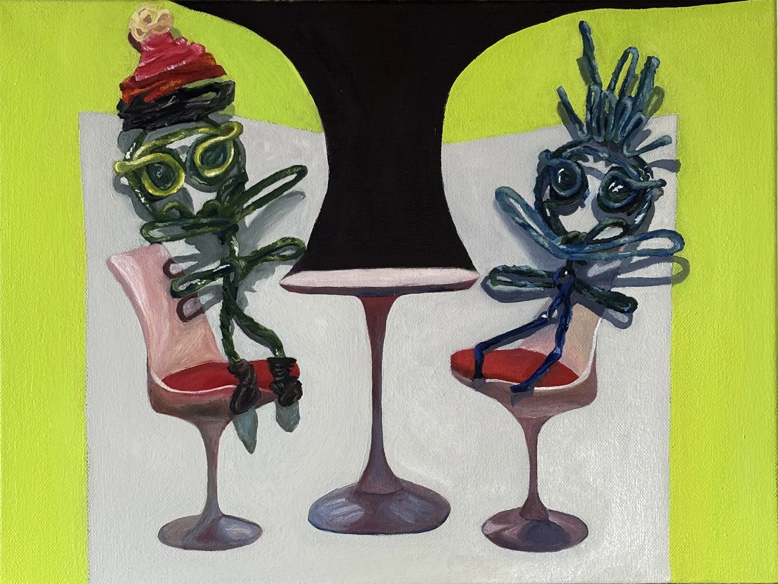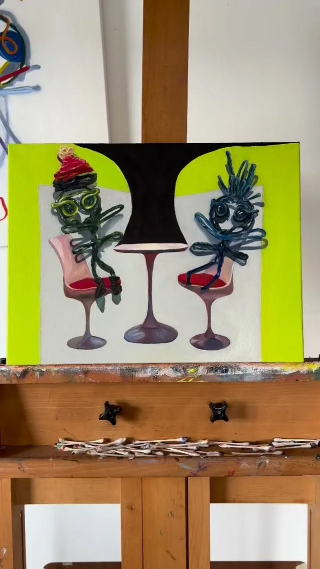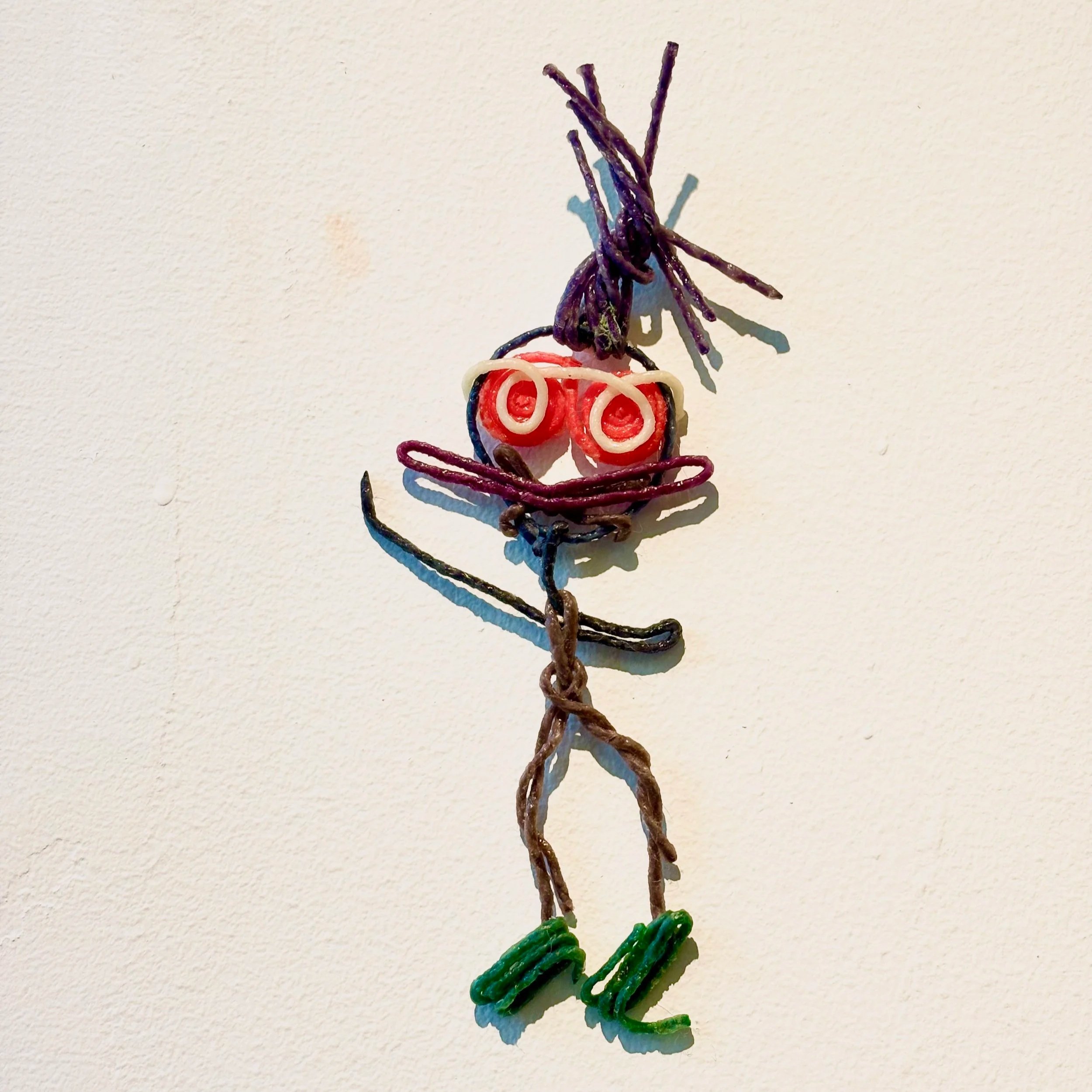 Profound, but not confusing; invoking emotion but not underestimating the Viewer’s intelligence; exploring all possibilities but never straying too far from certainty (or creating new certainties). Using perceived frivolity to make us think about society, politics, relationships and life is my primary focus. I work with wax strings. I use them to create colorful, whimsical people and then they become the subjects of my paintings. The figures have a lot of dimension and really pop off of the canvas. They are fanciful on one hand and cutting on the other. They are smile invoking and thought provoking. They are gibberish and sharply communicative. I happened upon wax strings while playing with my children. They were playing and deeply engaged with making and stacking shapes all the while completely uninterested in what I was doing. So, I experimented. Then I painted. My goal with these is to delight and confuse and to make people stop and consider human expression in a new way!