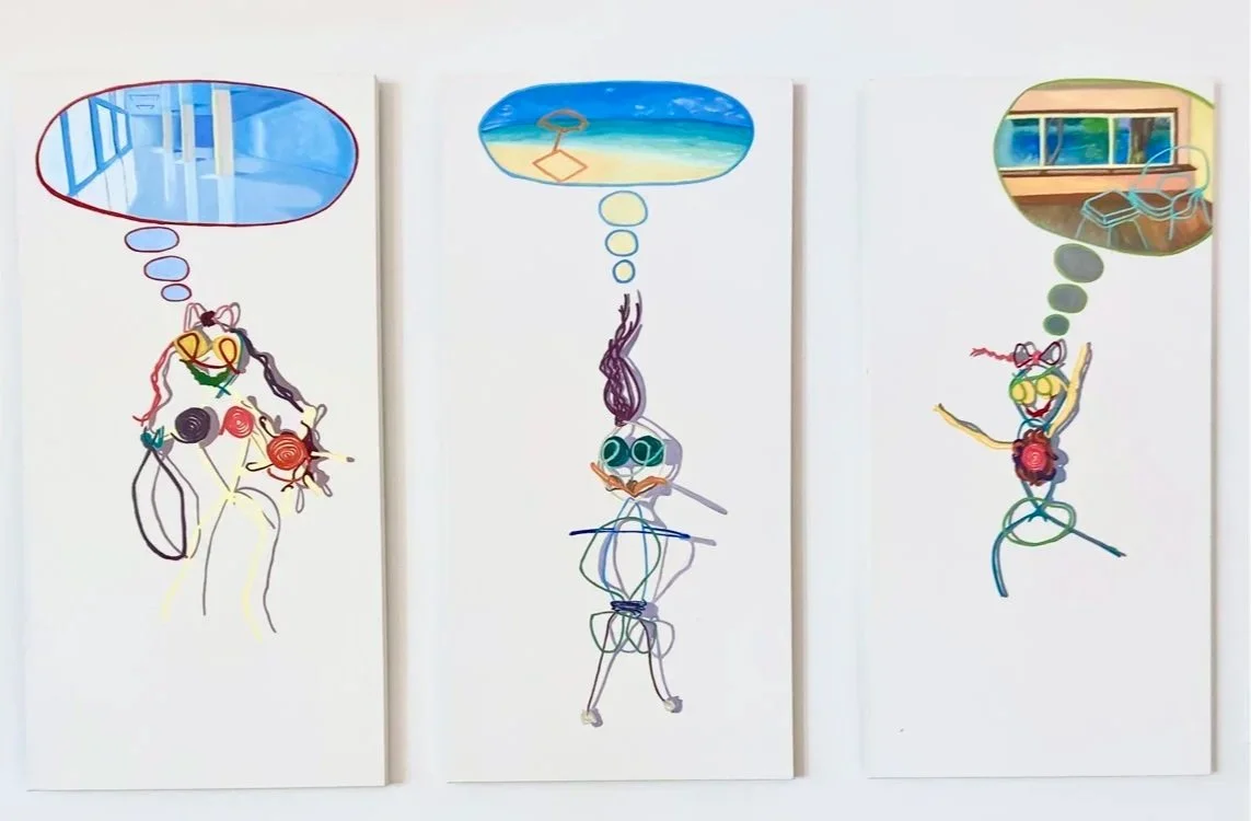 The bold, edgy figures emerge from the canvas, offering a twist on traditional portraiture. Each painted figure is not just a static representation but a character with a voice—depicted through word and thought bubbles that invite viewers into their unique perspectives. A male figure might confidently declare "talk," while a female figure contemplates "action," creating a dialogue that encourages reflection on the interactions and dynamics within our own lives. These paintings are an exploration of communication, intention, and the raw nature of human expression.