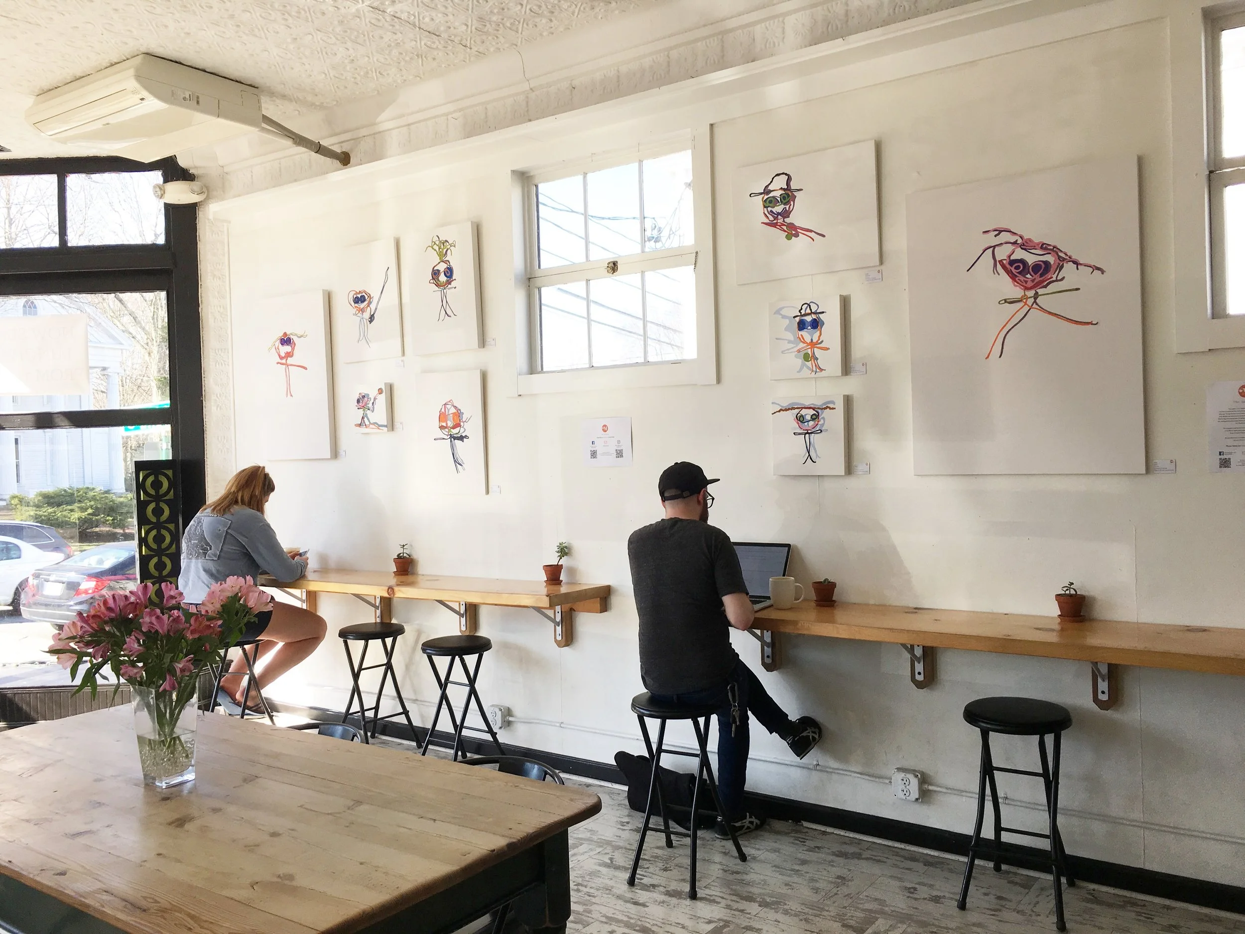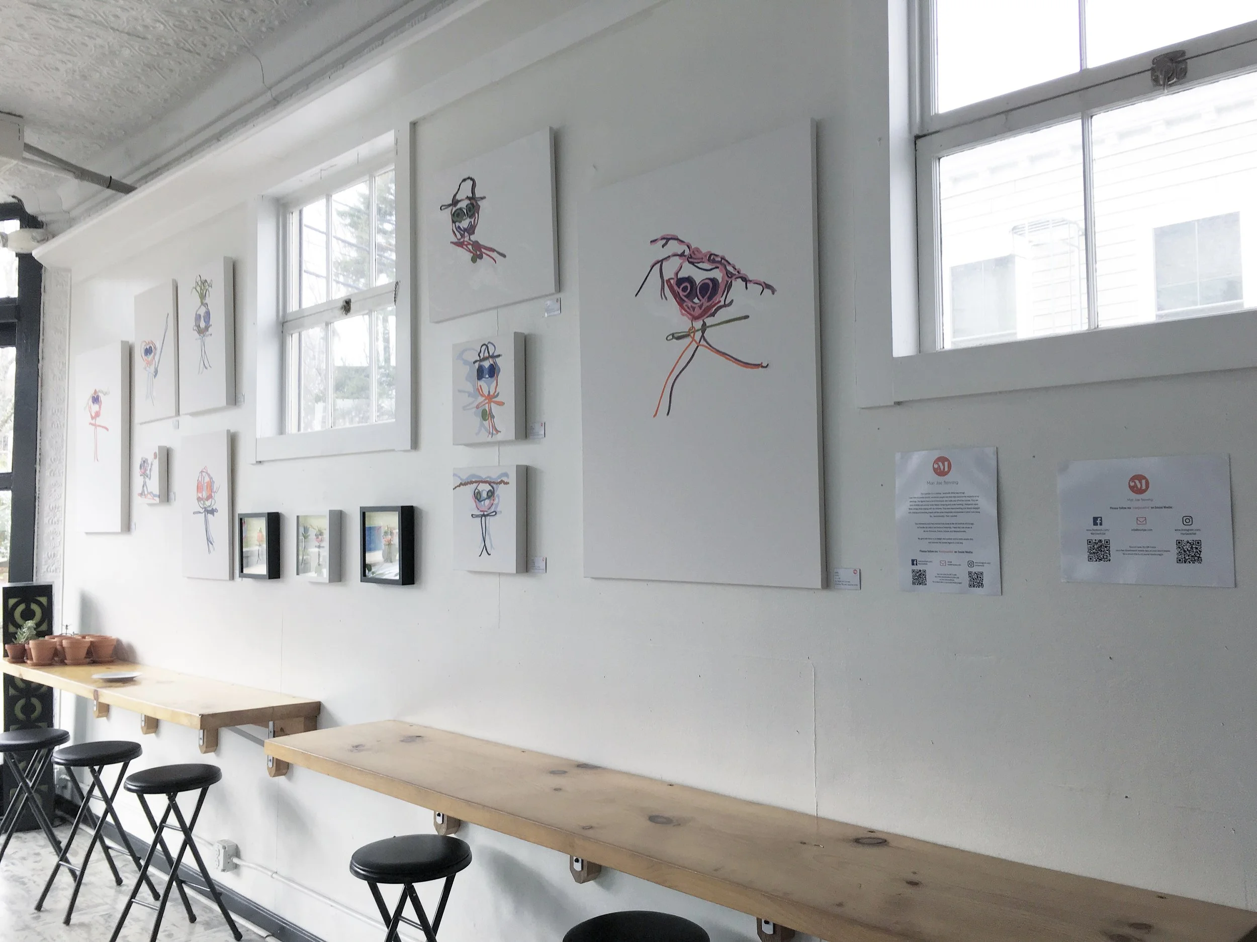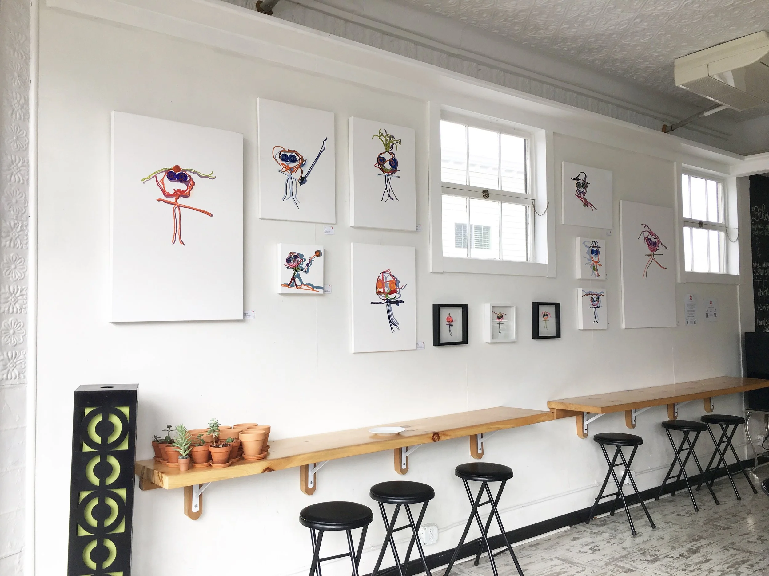 The wax string figure that inspired this painting is an example of a happy mistake. I made the figure and then it got squashed. Instead of fixing it, I looked at it in a new way and thought that the arms and the legs being mushed together was really interesting. As I was painting it, it became clear that he was flying.