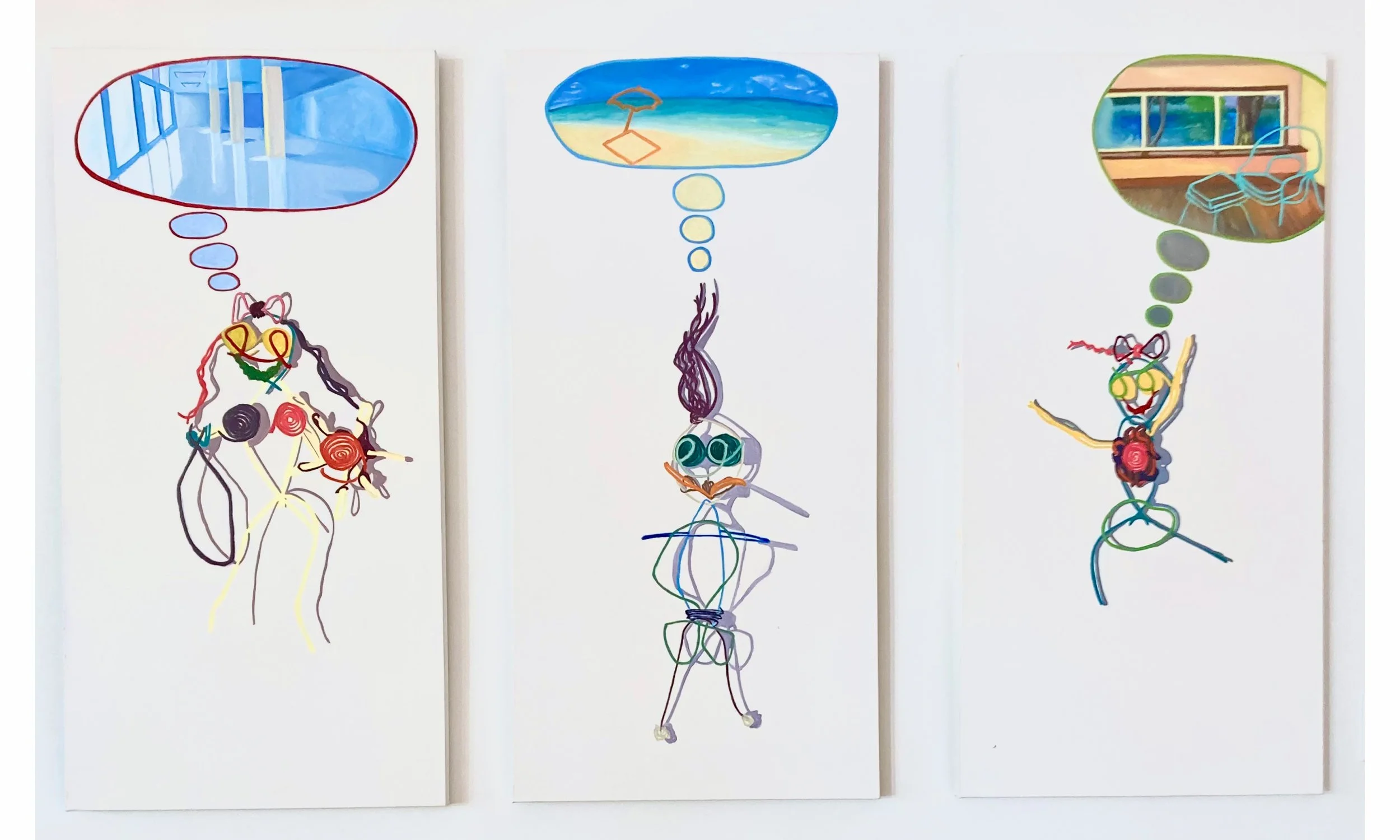 When my figures start to imagine, we get a glimpse into merging realities. Through the use of thought bubbles, I am showing how the figure creates an image of the real beach complete with a wax umbrella and blanket to think about. I don’t imagine that he feels a sense of longing but rather a reinterpretation of the what the world could be.
