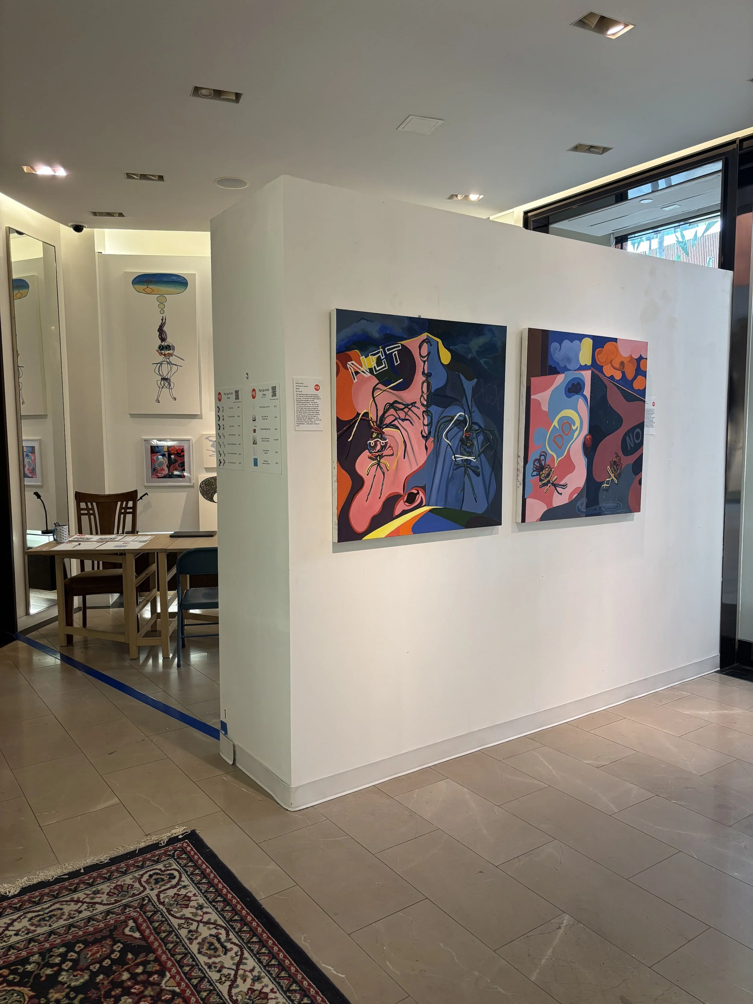This painting is about interpretation. The “cloudy” in the middle represents an issue. On the left, the bright colorful figure stares straight out with confidence and clarity. He stands under a bold word, “not,” as if to say “my view on this issue is not cloudy.” On the right hand side, the figure is dark, gloomy and standing in shadow. He stares intently at the bright figure. The word “huh” is obscured, looming above, indicating that this figure is masking fear with aggression. He is ultimately really confused. The pink hair tie that he’s wearing? Open for interpretation. What does it mean to you?