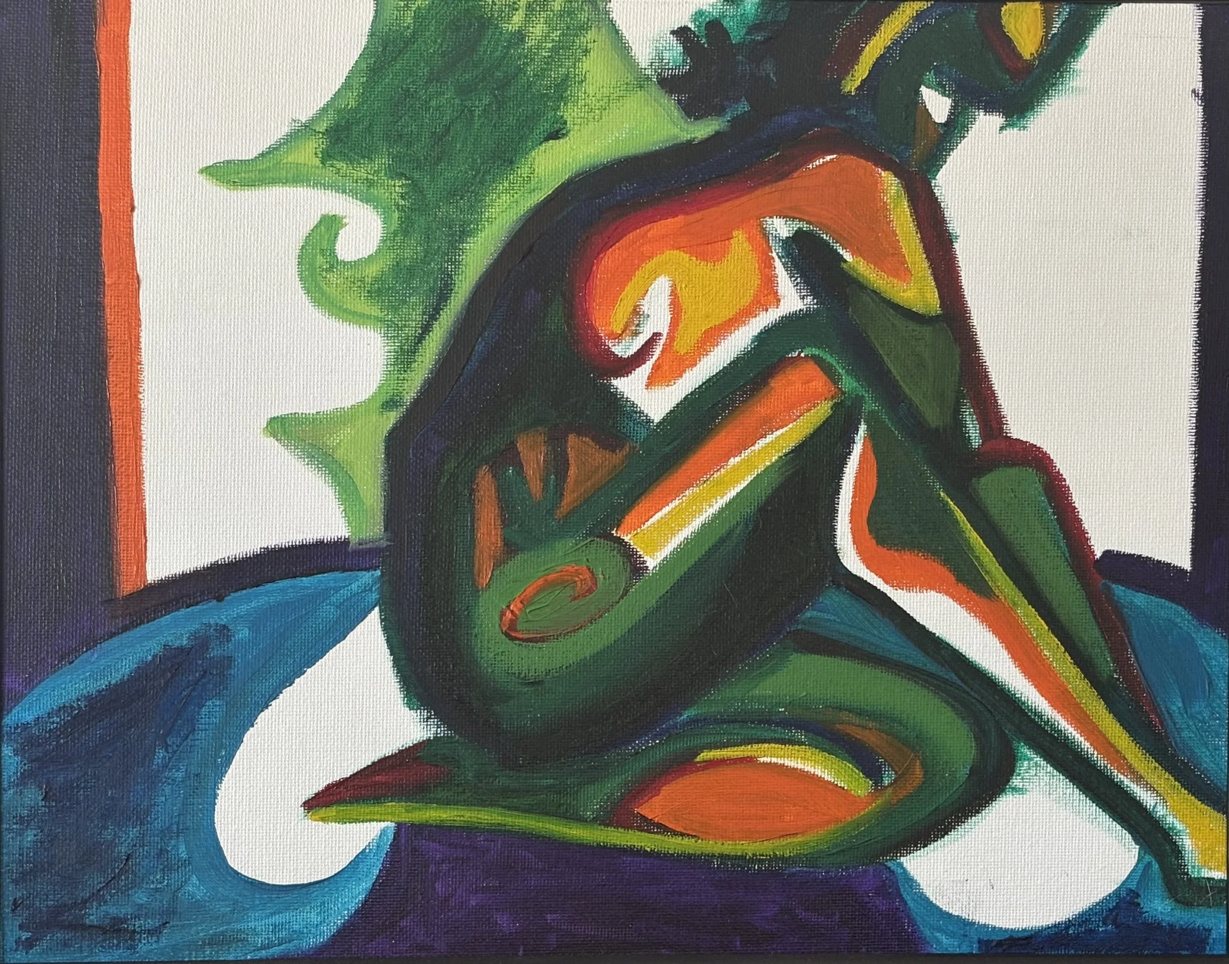 Capture the essence of new life with this stunning oil painting using rich green hues and its compliment orange, depicting a pregnant woman in a unique abstract style.